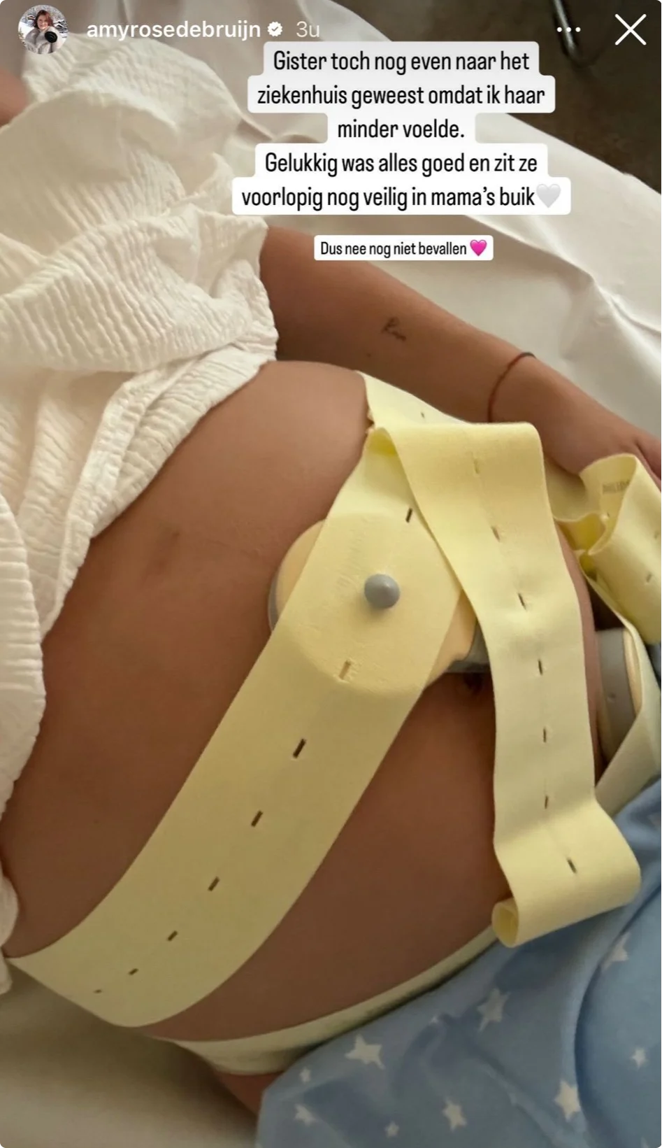 Bij een foto in haar Instagram-Story schrijft ze: "Ik ben gister toch nog even naar het ziekenhuis geweest omdat ik haar minder voelde. Gelukkig was alles goed en zit ze voorlopig nog veilig in mama's buik." Amy geeft ook direct duidelijkheid dat ze nog niet bevallen is.