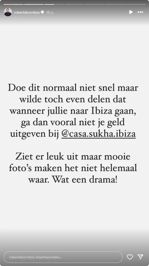 De voormalig autocoureur wil zijn volgers die vakantieplannen hebben naar Ibiza, waarschuwen. "Geef je geld vooral niet uit aan Casa Sukha Ibiza. Het ziet er leuk uit maar de mooie foto’s maken het niet helemaal waar. Wat een drama!"