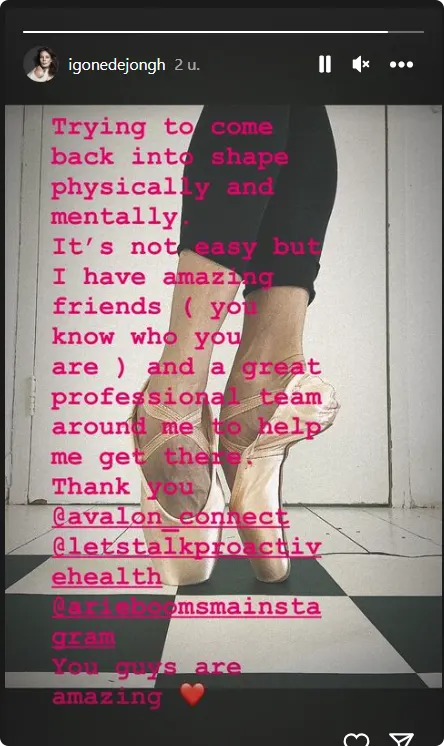 "Ik probeer mentaal en fysiek weer terug in vorm te komen", schrijft ze bij een foto van haar spitzen. "Het is niet makkelijk, maar ik heb geweldige vrienden (jullie weten wie je zijn) en een geweldig professioneel team die me helpen om daar te komen." Ze bedankt in het bericht onder anderen Arie Boomsma. "Jullie zijn geweldig."
