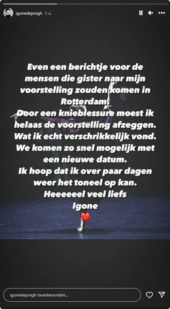 In haar Instagram verhaal laat Igone nu weten het echt verschrikkelijk te vinden dat haar voorstelling niet door kon gaan.