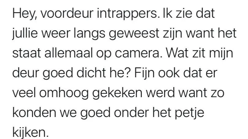 "Hey, voordeur-intrappers. Ik zie dat jullie weer langs geweest zijn want het staat allemaal op camera", schrijft de 41-jarige. "Wat zit mijn deur goed dicht hè? Fijn ook dat er veel omhooggekeken werd want zo konden we goed onder het petje kijken."