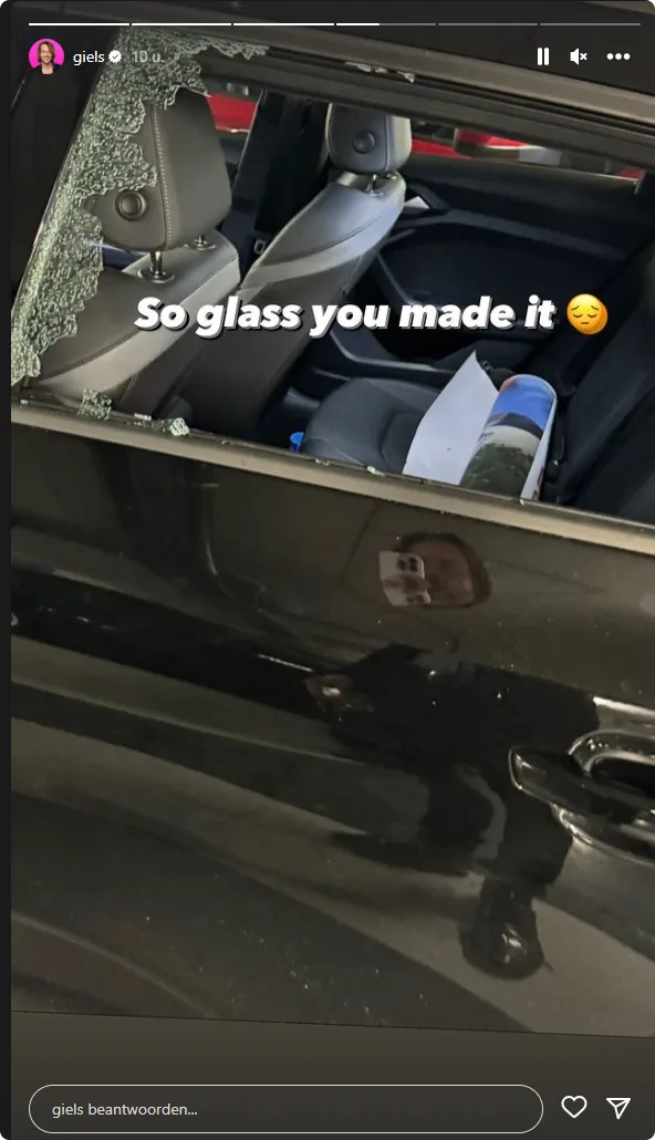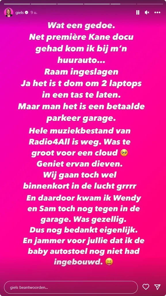 "Net première Kane docu gehad kom ik bij m'n huurauto... raam ingeslagen", schrijft de 46-jarige Giel. "Het is dom om 2 laptops in een tas te laten. Maar man het is een betaalde parkeergarage."