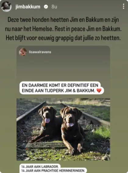 Dit deelt Jim zelf op Instagram. In zijn Stories is een bericht te zien van het baasje van de overleden honden. "En daarmee komt er definitief een einde aan tijdperk Jim & Bakkum. 14 jaar aan labrador. 14 jaar aan prachtige herinneringen. Allebei 12,5 jaar oud mogen worden. Ga nog vaak aan jullie denken, vriendjes."