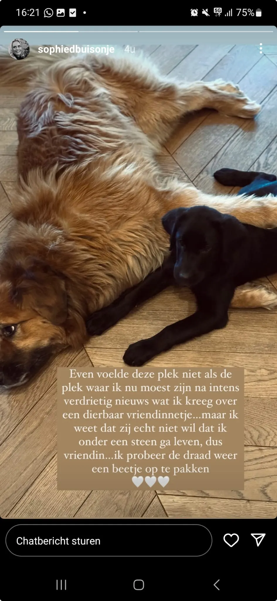 Sophie schrijft bij een foto van haar hondjes: "Even voelde deze plek niet als de plek waar ik nu moest zijn na intens verdrietig nieuws wat ik kreeg over een dierbaar vriendinnetje... Maar ik weet dat zij echt niet wil dat ik onder een steen ga leven, dus vriendin... Ik probeer de draad weer een beetje op te pakken!" Tekst gaat verder onder Instagram-post...