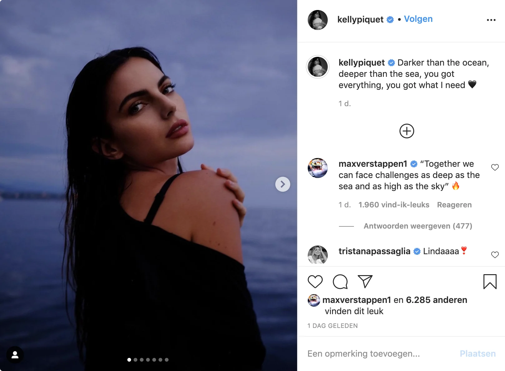 Max heeft voor het eerst openlijk op Instagram gereageerd op een post van Kelly Piquet. Zij is de dochter van Formule 1-legende Nelson Piquet, die getrouwd is met een Nederlandse vrouw: Sylvia Tamsma. Verstappen volgt Kelly al een tijdje op Instagram en sinds augustus is te zien dat hij veel van haar berichten leuk vindt.
