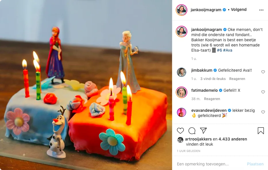 "Oke mensen, don’t mind die onderste rand fondant.. Bakker Kooijman is best een beetje trots (wie 6 wordt wil een homemade Elsa-taart)", schrijft Jan bij de foto.