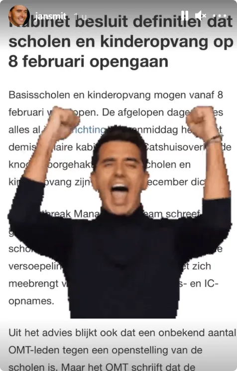 Op Instagram reageert Jan op het nieuws. Hij deelt een screenshot van het nieuws en plaatst daar een GIFje bij van zichzelf, waarin hij duidelijk door het dolle heen is.