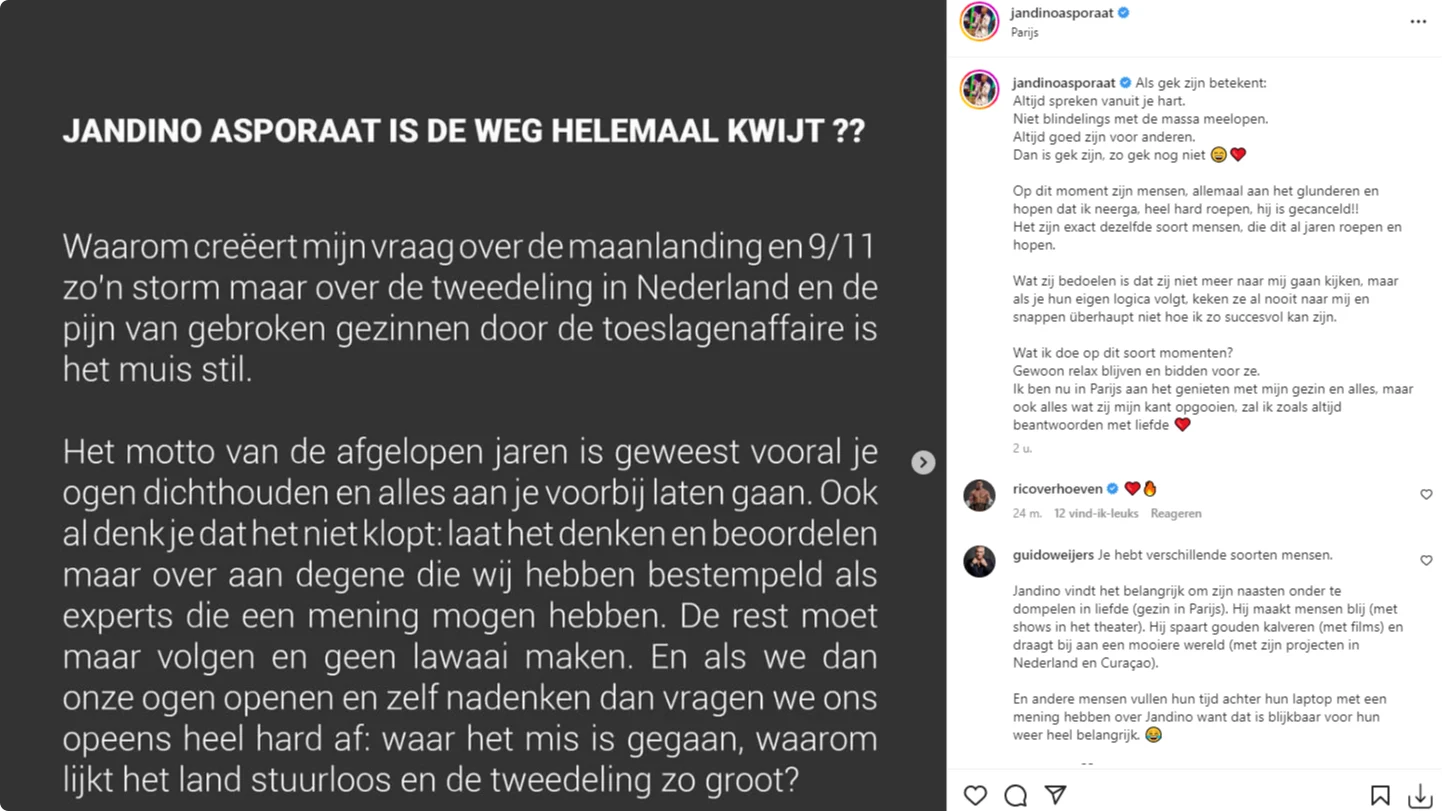 Maar Asporaat kiest er bewust voor om juist wel zijn mond open te blijven doen. "Voor de mensen die soms terecht of onterecht voelen dat hun stem niet wordt gehoord. Natuurlijk wordt er gezegd Jandino, zeg nou maar niks anders gaan ze jou cancelen, maar hoe hou jij je mond is dan mijn vraag."