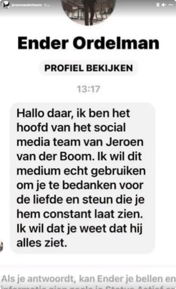 "Hallo daar, ik ben het hoofd van het social media team van Jeroen van der Boom", valt in het bericht te lezen. "Ik wil dit medium echt gebruiken om je te bedanken voor de liefde en steun die je hem constant laat zien. Ik wil dat je weet dat hij alles ziet."