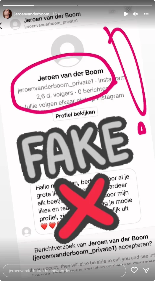 Het is niet de eerste keer voor Jeroen dat iemand anders actief is op Instagram onder zijn naam. In 2020 overkwam hem dit ook al. Destijds liet hij zijn volgers het volgende weten: