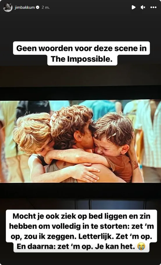 De acteur is namelijk ziek, wat hij precies heeft schrijft hij er niet bij. Hij plaatst op zijn Instagram Story een foto van zijn televisiescherm. "Geen woorden voor deze scene in The Impossible", schrijft hij bovenaan. Daaronder plaatst hij: "Mocht je ook ziek op bed liggen en zin hebben om volledig in te storten: zet 'm op, zou ik zeggen. Letterlijk. Zet 'm op. En daarna: zet 'm op. Je kan het". Hierachter plaatst hij een huilende emoji.