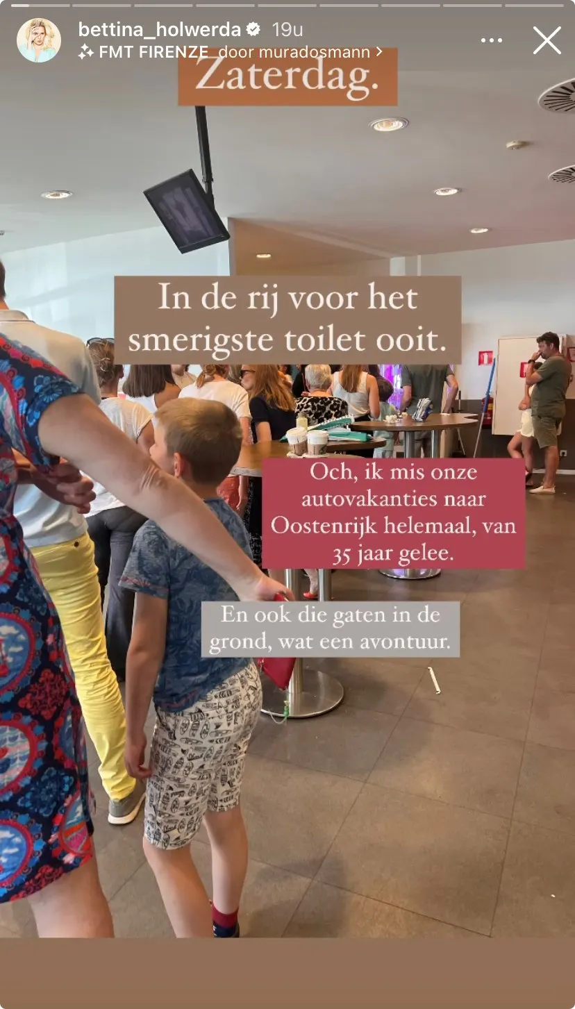"In de rij voor het smerigste toilet ooit", aldus Bettina in haar Instagram Stories. "Och, ik mis onze autovakanties naar Oostenrijk helemaal, van 35 jaar gelee." Holwerda laat vervolgens weten dat het minder druk op de weg is dan verwacht. Ze noemt het geen zwarte maar "donkergrijze" zaterdag.
