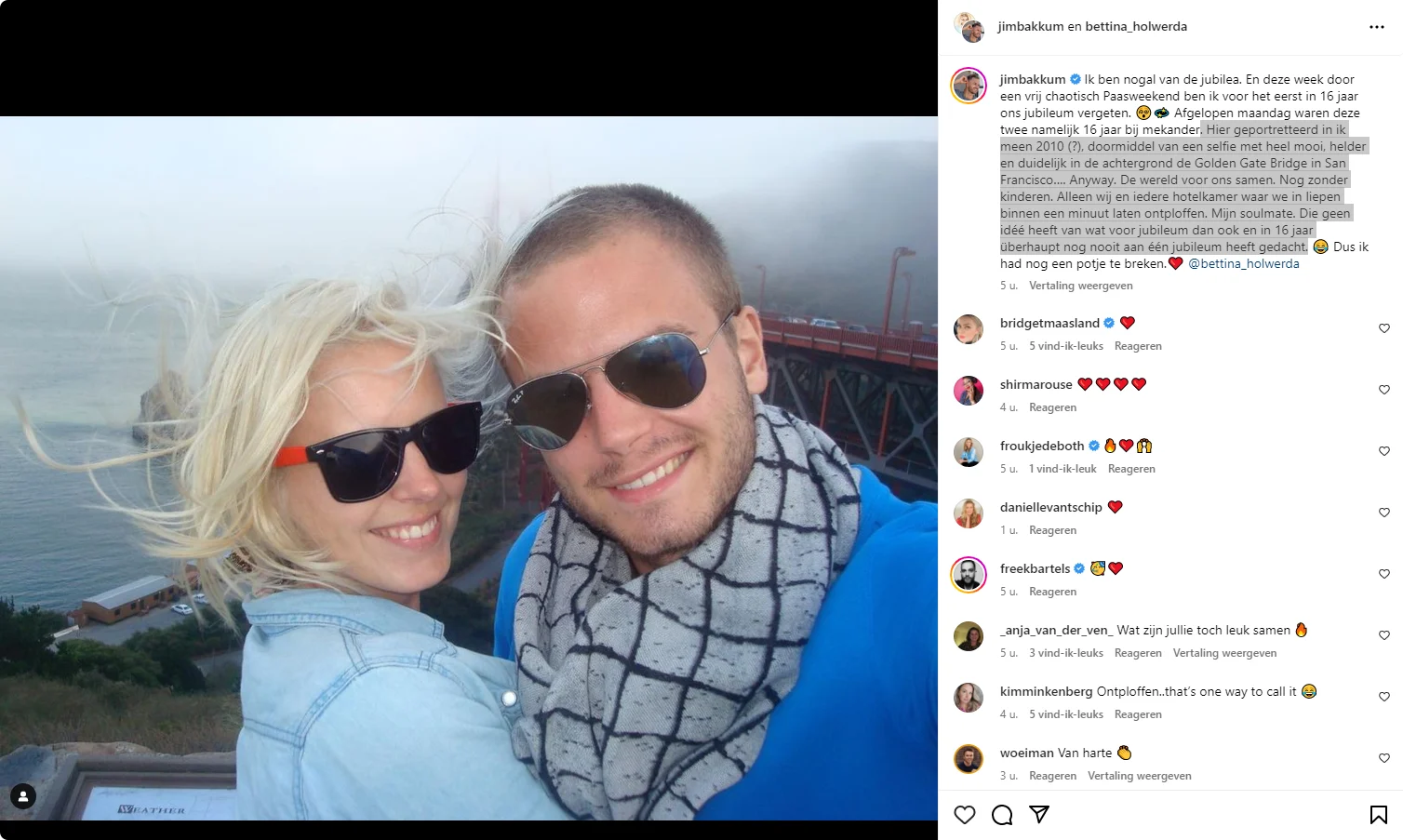 Omdat Jim de speciale dag vergeten is, plaatst hij een ontzettend lief berichtje op Instagram met een té lieve foto waarop Jim en Bettina samen te zien zijn. "Deze week door een vrij chaotisch Paasweekend ben ik voor het eerst in 16 jaar ons jubileum vergeten", begint Jim zijn verhaal.