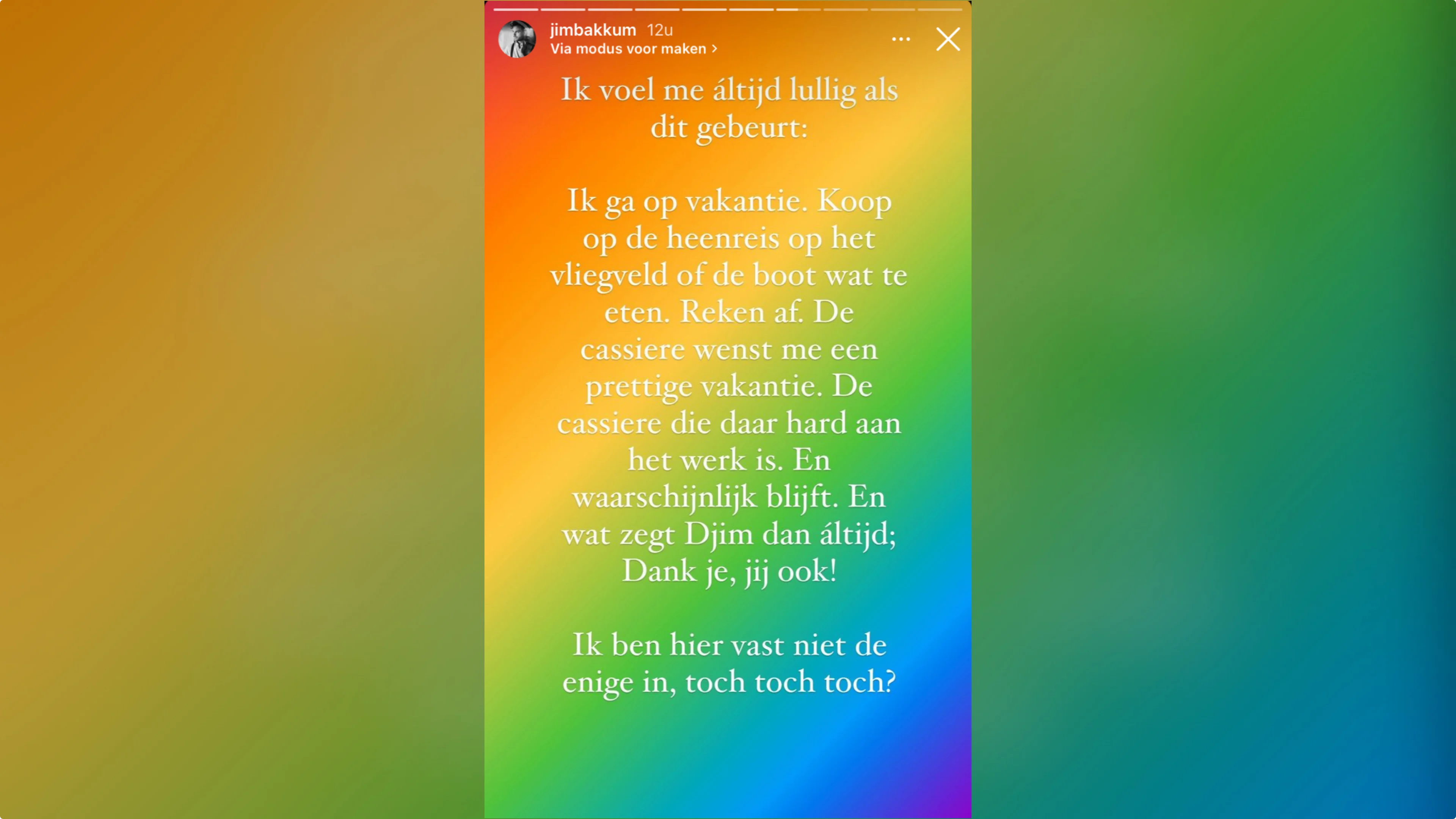 De acteur, die zich hier lullig over voelt, schrijft op Instagram: "Ik ga op vakantie. Koop op de heenreis op het vliegveld of op de boot wat te eten. Reken af. De caissière wenst me een prettige vakantie. En wat zegt Djim dan áltijd; Dank je, jij ook!"