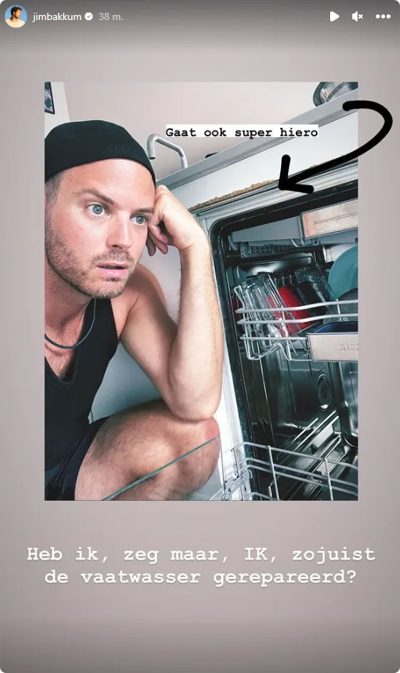 "Heb ik, zeg maar, ik, zojuist de vaatwasser gerepareerd". zo schrijft Jim in zijn Instagram Stories. Op de foto is te zien dat Jim erg verbaasd is van zijn eigen kunnen.
