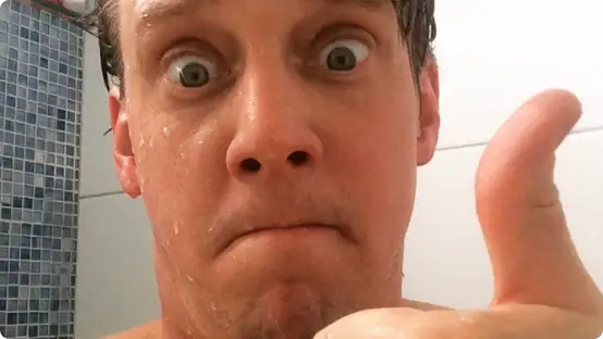 "Tijd voor #Kapsalontheater", schrijft Myjer bij een foto waarop hij onder de douche staat.