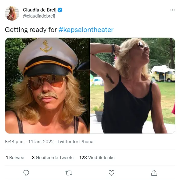 "Getting ready for #kapsalontheater", schrijft De Breij bij een foto als reden waarom ze een neppe snor en okselhaar 'draagt'.