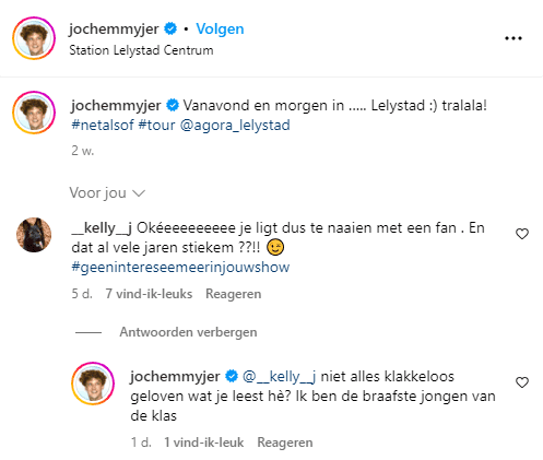 "Vanavond en morgen in Lelystad", zo schrijft Jochem op zijn Instagram twee weken geleden. Een volger van hem heeft de roddels van Yvonne gelezen en reageert vorige week onder het bericht met: "Oke je ligt dus te naaien met een fan, en dat al vele jaren stiekem?" De cabaretier reageert op de opmerking met: "Niet alles klakkeloos geloven wat je leest he? Ik ben de braafste jongen van de klas."