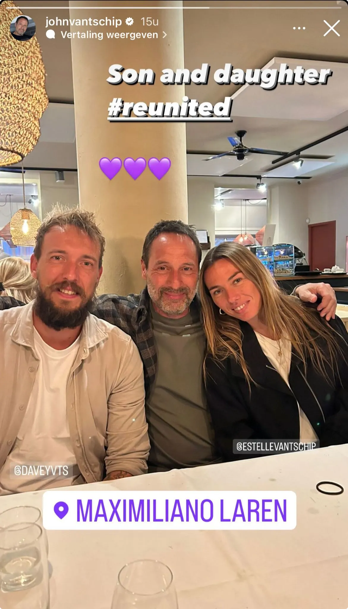 Op de foto is te zien dat ze met z'n drieën uiteten zijn in Laren. "Zoon en dochter. Herenigd", schrijft John erbij. Aan de tekst te zien hebben ze elkaar al enige tijd niet gezien; zoon Davey woont in Australië en dochter Estelle was op reis, zo is te zien op haar Instagram.