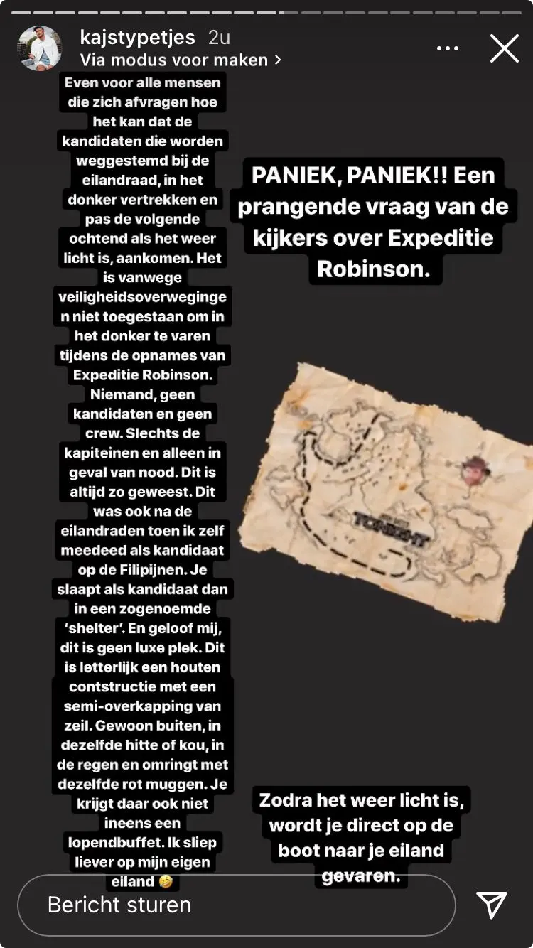 "Het is vanwege veiligheidsoverwegingen niet toegestaan om in het donker te varen. tijdens de opnames van Expeditie Robinson. Niemand, geen kandidaten en geen crew. Slechts de kapiteins en alleen in geval van nood.", aldus Kaj op Instagram. "Dit is altijd zo geweest.