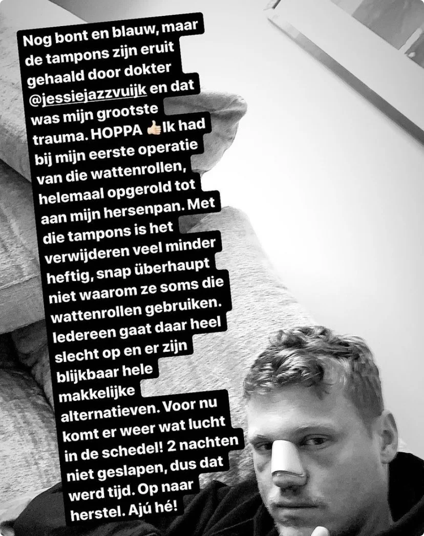 Op social media schrijft de bont en blauwe Kaj: "Ik had bij mijn eerste operatie van die wattenrollen, helemaal opgerold tot aan mijn hersenpan. Met tampons is het verwijderen veel minder heftig. Snap überhaupt niet waarom ze soms die wattenrollen gebruiken. Iedereen gaat daar heel slecht op en er zijn blijkbaar hele makkelijke alternatieven."