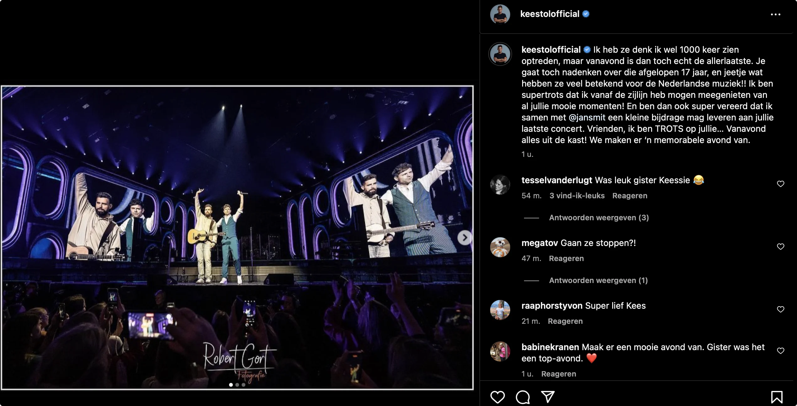 "Ik heb ze denk ik wel 1000 keer zien optreden, maar vanavond is dan toch echt de allerlaatste. Je gaat toch nadenken over die afgelopen 17 jaar, en jeetje wat hebben ze veel betekend voor de Nederlandse muziek!", vindt Kees. "Ik ben supertrots dat ik vanaf de zijlijn heb mogen meegenieten van al jullie mooie momenten!"