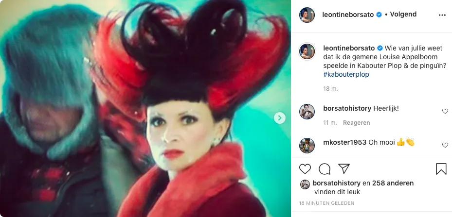 "Wie van jullie weet dat ik de gemene Louise Appelboom speelde in Kabouter Plop & de pinguïn? #kabouterplop" schrijft Leontine bij onderstaande foto.