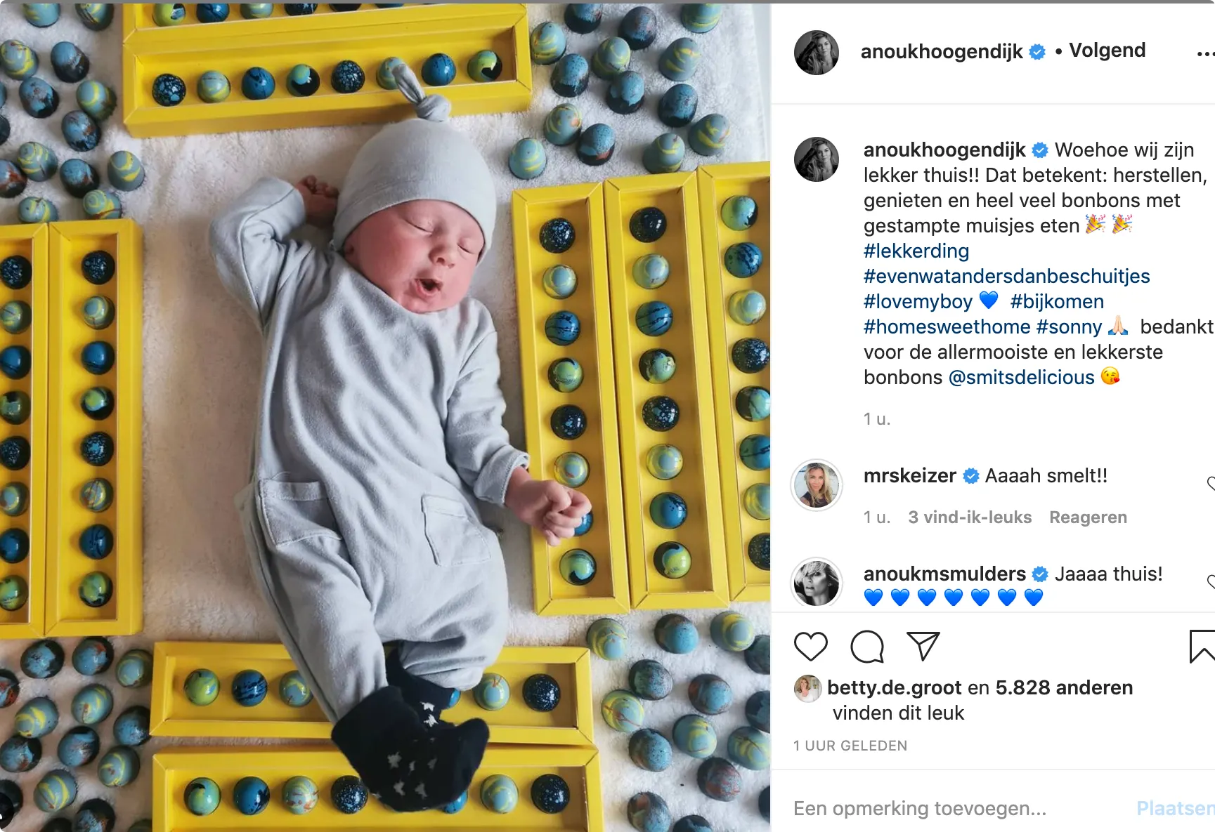 Op Instagram laat ze weten: "Woehoe wij zijn lekker thuis!! Dat betekent: herstellen, genieten en heel veel bonbons met gestampte muisjes eten #lekkerding #evenwatandersdanbeschuitjes #lovemyboy #bijkomen#homesweethome #sonny. Bedankt voor de allermooiste en lekkerste bonbons."