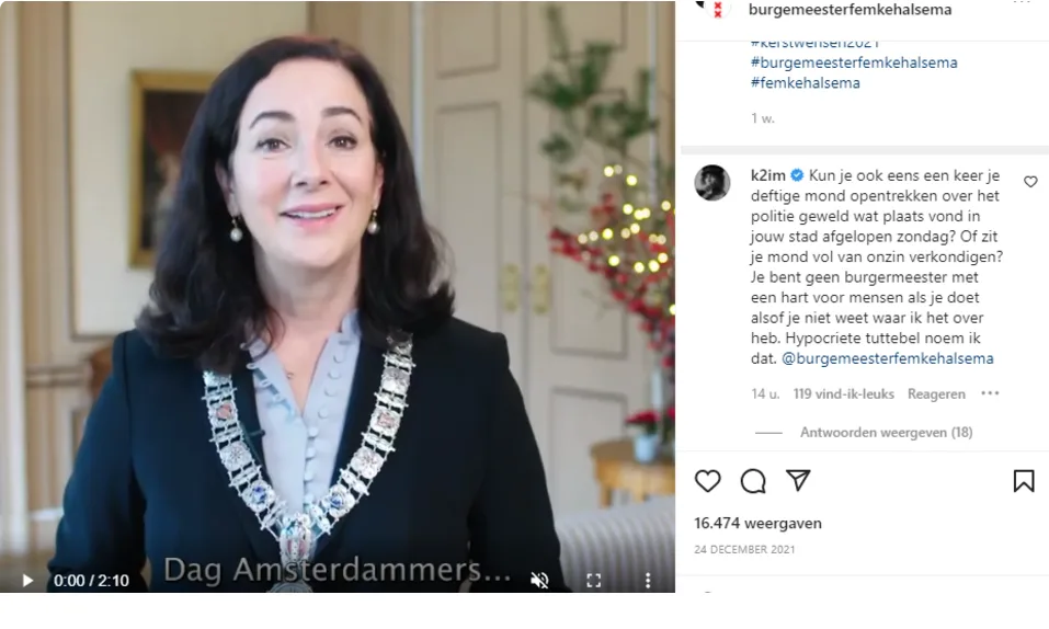 Kim Feenstra heeft begin dit jaar flink uitgehaald naar burgemeester Femke Halsema van Amsterdam. Ze vindt dat er op de eerste zondag van 2022, tijdens het anti-coronaprotest in Amsterdam, namelijk buitenproportioneel veel politiegeweld is gebruikt. Ze begint haar tirade met: “Kun je ook eens een keer je deftige mond opentrekken over het politie geweld wat plaats vond in jouw stad afgelopen zondag? Of zit je mond vol van onzin verkondigen?"