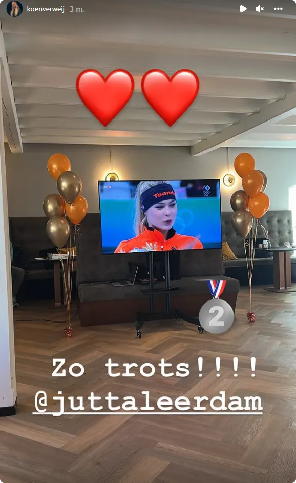 Jutta Leerdam heeft op de Olympische Spelen van Beijing zilver gewonnen op de 1000 meter. Vriendlief Koen Verweij keek vanuit Nederland mee en reageert op social media op deze bijzondere overwinning.