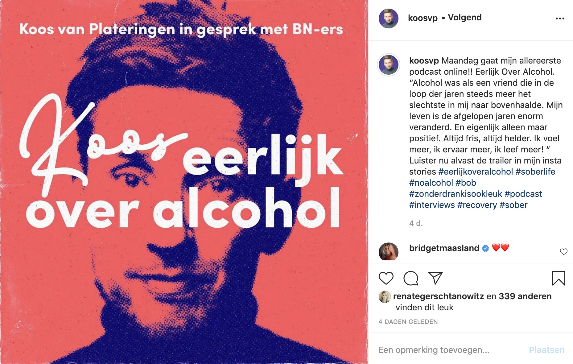 Afgelopen weekend schreef Koos nog: "Maandag gaat mijn allereerste podcast online: Eerlijk Over Alcohol! “Alcohol was als een vriend die in de loop der jaren steeds meer het slechtste in mij naar boven haalde. Mijn leven is de afgelopen jaren enorm veranderd. En eigenlijk alleen maar positief. Altijd fris, altijd helder. Ik voel meer, ik ervaar meer, ik leef meer!", schreef hij bij onderstaande post.