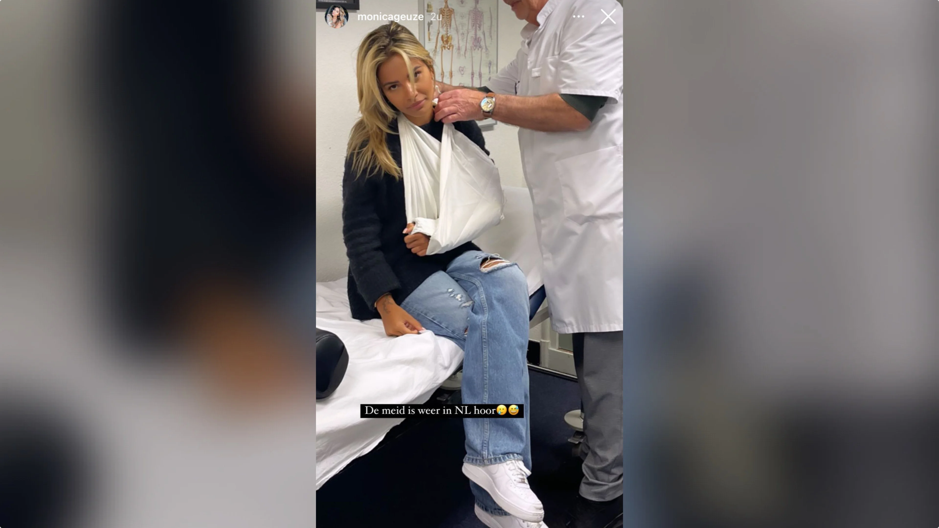 Op Instagram deelt Monica een foto met een mitella om. Zelf omschrijft ze het ongeluk als 'een lompe actie'. "Mega veel lieve berichtjes over wat er is gebeurd en ik zou willen dat ik een stoer verhaal had, maar eigenlijk komt het neer op een lompe actie."