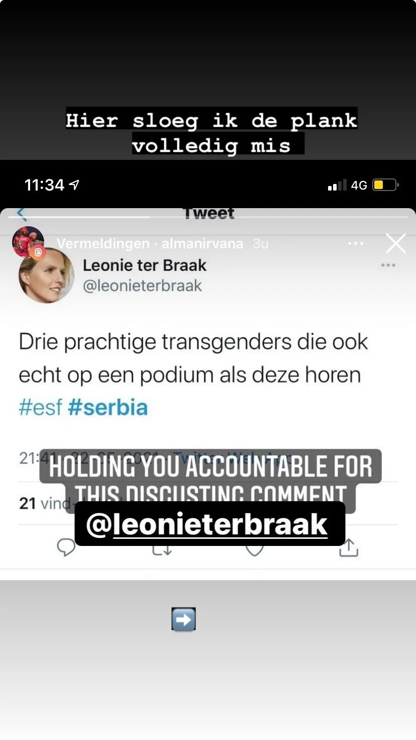 Leonie deelt een screenshot van haar misplaatste grap op haar Instagram Stories. Te zien is hoe zij gisteravond tweette "Drie prachtige transgenders die ook echt op een podium als deze horen #esf #serbia".