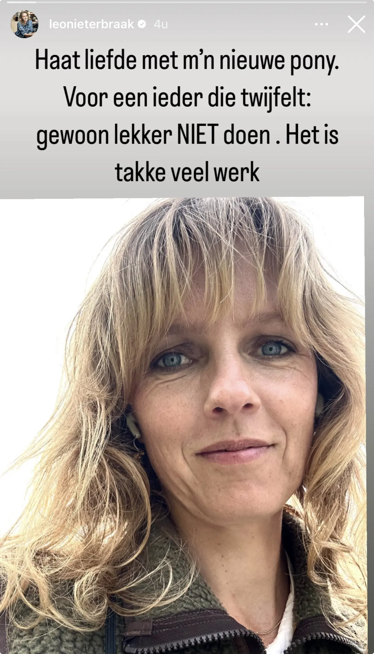 Haat liefde met m'n nieuwe pony. Voor ieder die twijfelt: gewoon lekker niet doen", zo waarschuwt Leonie haar volgers op Instagram. "Het is takke veel werk." Of Leonie dus lang met deze nieuwe coupe door het leven gaat is nog maar de vraag.