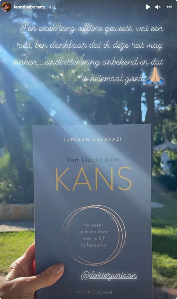 Leontine verblijft in het Spaanse Malaga om een cursus rond zelfontplooiing en -ontwikkeling te volgen bij de bekende coach Juriaan Galavazi. Waar ook het boek op de foto door is geschreven. De retraite is bedoeld voor mensen die fysieke of mentale klachten ervaren door druk van bijvoorbeeld het gezin en daardoor moe of opgebrand zijn, aldus de website van de coach.