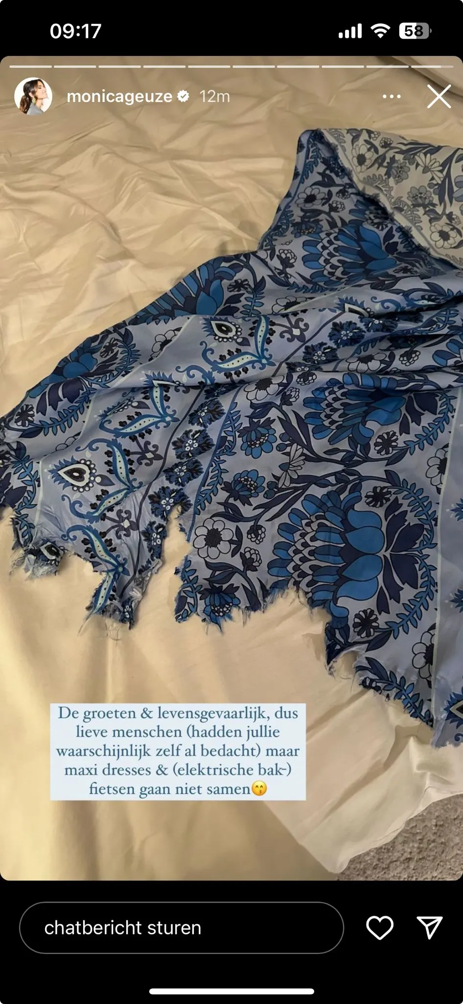 "De groeten & levensgevaarlijk, dus lieve mensen (hadden jullie waarschijnlijk zelf al bedacht), maar maxi dresses & elektrische bak-) fietsen gaan niet samen", schrijft Monica bij haar laatste Story, waar haar toegetakelde jurk te zien is.