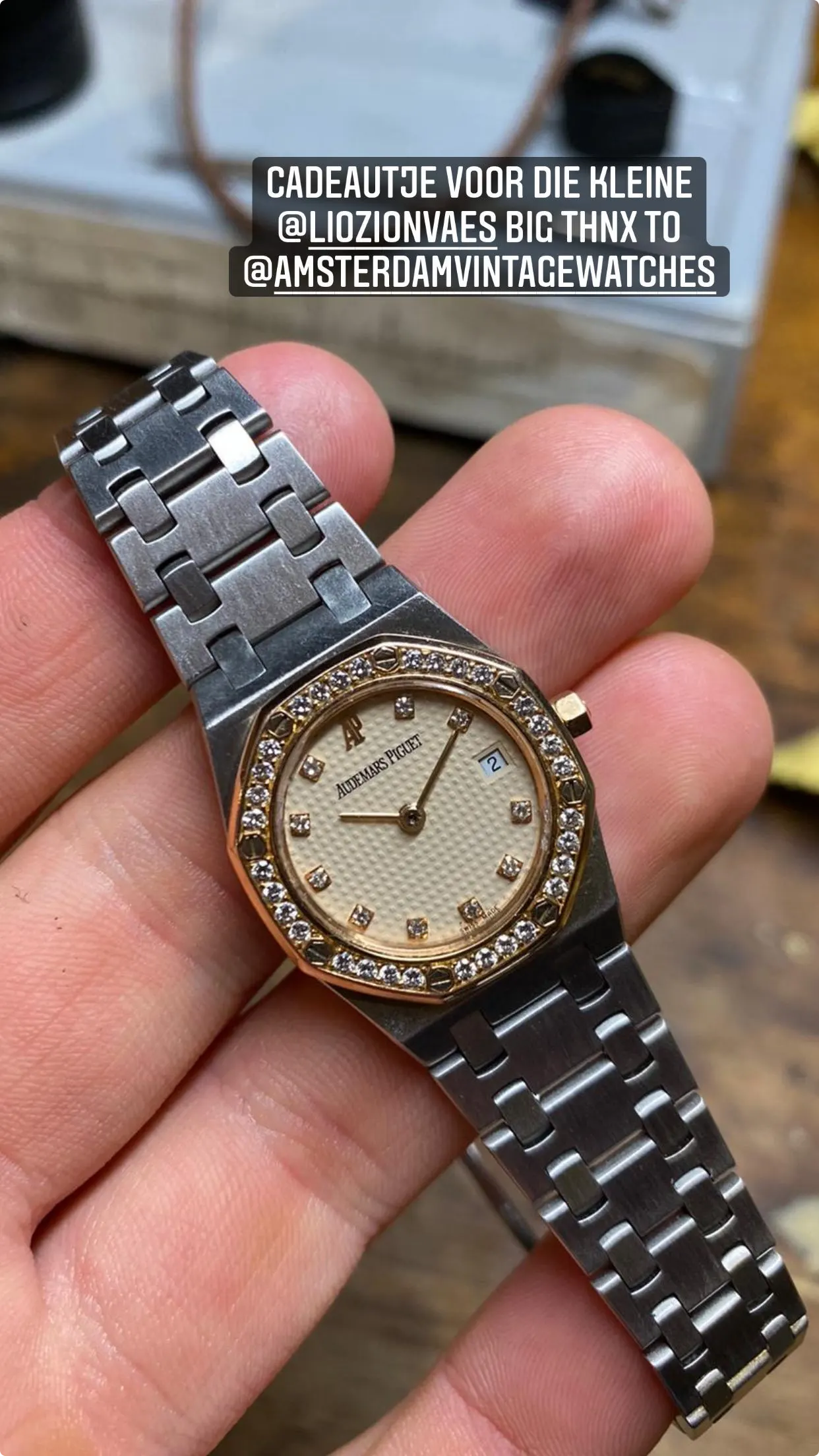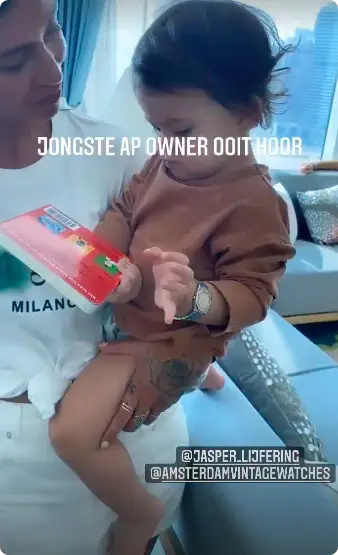 Jorik, zoals de rapper in het dagelijks leven heet, showt het cadeau voor zijn zoon op Instagram. Zo schrijft hij bij onderstaande foto: "Cadeautje voor die kleine!" Ook deelt hij een video waarop te zien is dat Lío het horloge draagt, "Jongste AP owner ooit hoor", aldus Kleine.