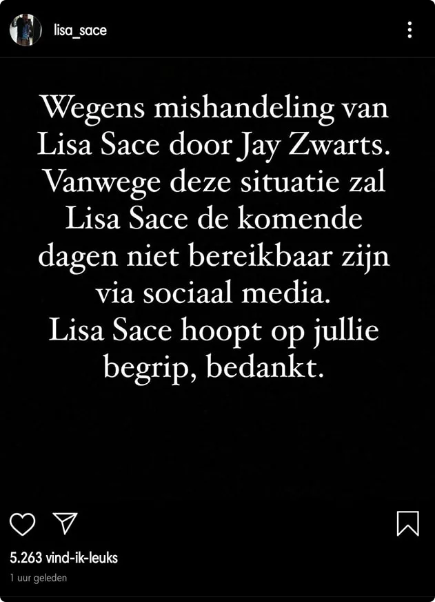 Lisa's volgers schrokken twee weken geleden op van een kort bericht op haar Instagram Stories. "Wegens mishandeling van Lisa Sace door Jay. Vanwege deze situatie zal Lisa Sace de komende dagen niet bereikbaar zijn via sociale media. Lisa Sace hoopt op jullie begrip, bedankt."
