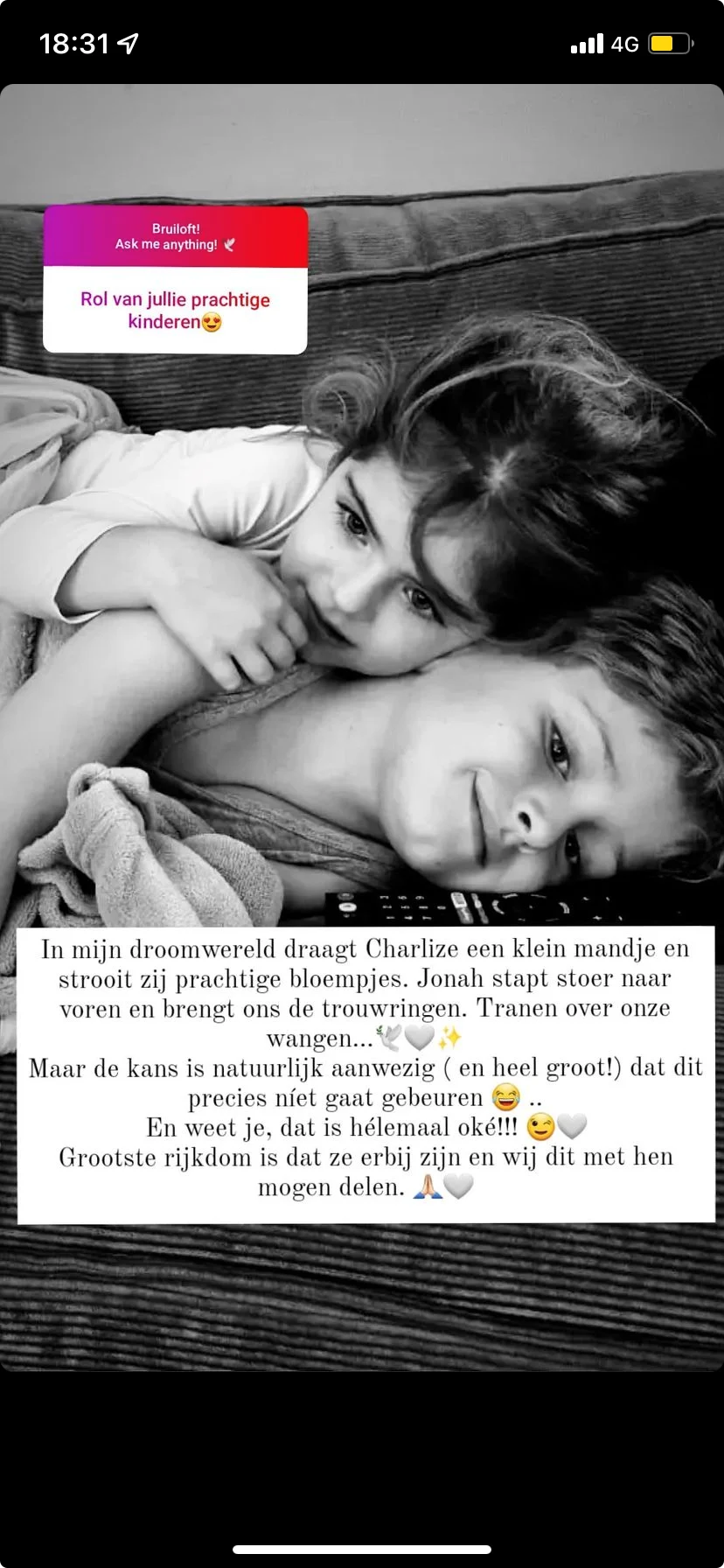 Volgers zijn ook erg benieuwd wat de rol van haar super schattige kinderen Charlize en Jonah wordt.... Op deze vraag antwoorde Liza: “In mijn droomwereld draagt Charlize een klein mandje en strooit zij prachtige bloempjes, Jonah stapt stoer naar voren en brengt ons de trouwringen. Tranen over onze wangen… Maar de kans is natuurlijk aanwezig (en heel groot!) dat dit precies níet gaat gebeuren. En weet je, dat is hélemaal oké! Grootste rijkdom is dat ze erbij zijn en wij dit met hen mogen delen", schrijft de actrice.
