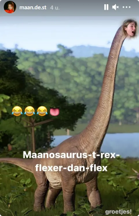 Nadat ook diverse BN'ers er dinsdag en woensdag hilarisch op reageren, kan Maan zelf niet achterblijven. Op Instagram deelt ze de onderstaande foto. "Maanosaurus-t-rex-flexer-dan-flex", schrijft ze op Instagram.