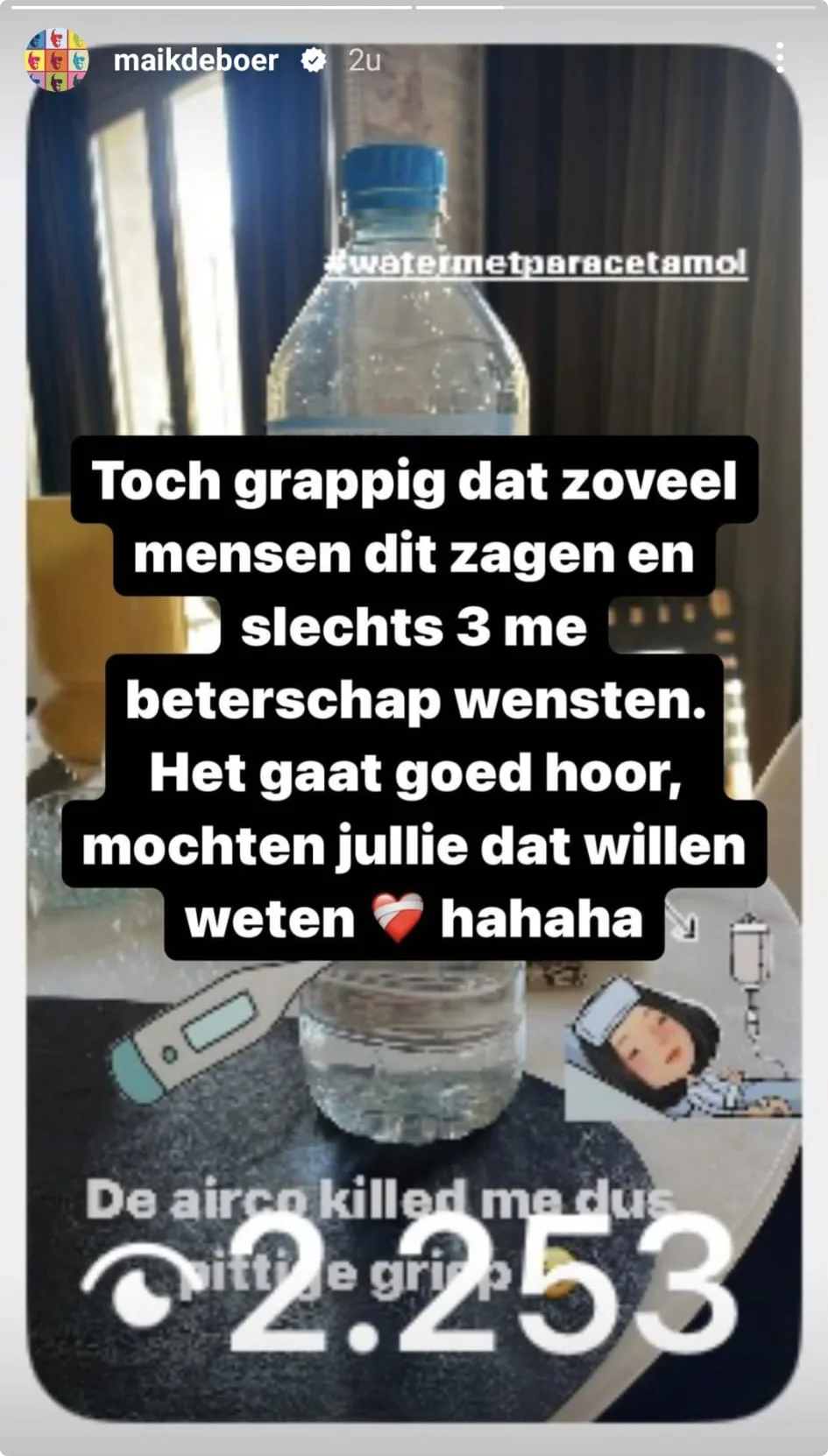 "De airco killed me, dus pittige griep", zo schreef Maik in zijn Instagram Stories. Hij kon helaas niet op veel steun rekenen. "Toch grappig dat zoveel mensen dit zagen en slechts 3 me beterschap wensten. Het gaat goed hoor, mochten jullie dat willen weten."