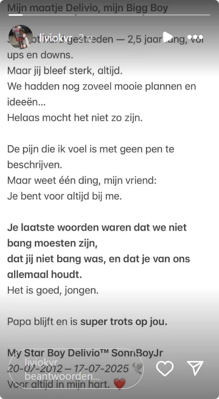 Zijn vader schrijft zaterdag in zijn Story op Instagram dat Delivio "2,5 jaar vol ups en downs heeft gestreden". Hij vervolgt: "We hadden nog zo veel mooie plannen en ideeën... Helaas mocht het niet zo zijn. De pijn die ik voel is met geen pen te beschrijven."