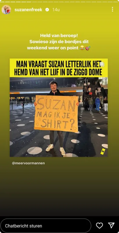 Op de foto zien we een man met een bord waarop staat: "Suzan mag ik je shirt?" Bij de foto schrijft het zangduo: "Held van beroep! Sowieso zijn de bordjes dit weekend weer on point".