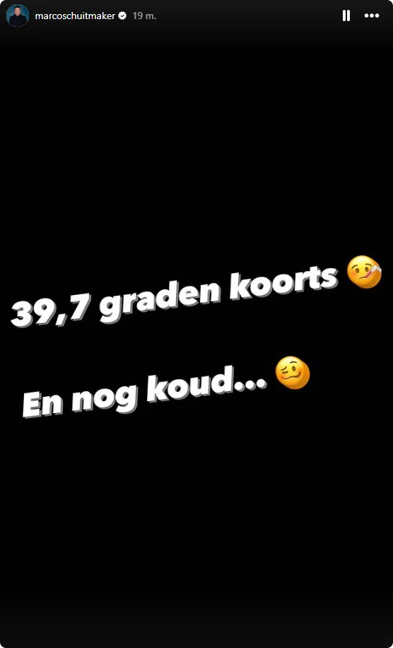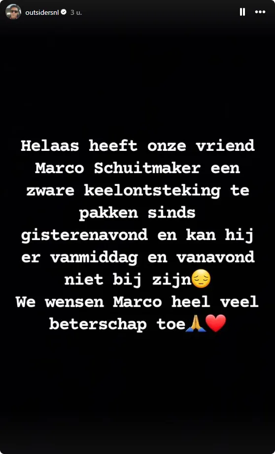 Dit vervelende nieuws deelt hij op Instagram. "39,7 graden koorts en nog koud...", schrijft hij op zijn Story. Hij herplaatst een story van de Outsiders die schrijven dat hij niet bij hun show kan zijn. "Helaas heeft onze vriend Marco Schuitmaker een zware keelontsteking te pakken sinds gisteravond. Hij kan er vanmiddag en vanavond niet bij zijn. Wij wensen Marco heel veel beterschap toe."