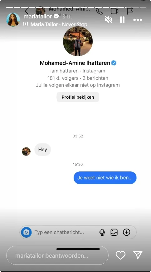 Al werd Mohamed in eerste instantie door zichzélf voor joker gezet, want diep in de nacht van vrijdag op zaterdag besloot hij plots een DM'etje te sturen naar Maria. 'Hey' luidde zijn berichtje, waarop Maria reageerde: 'Jij weet niet wie ik ben...' Maria, bekend van The Real Housewives of Amsterdam, is immers al twee jaar samen met Sander van der Meij.