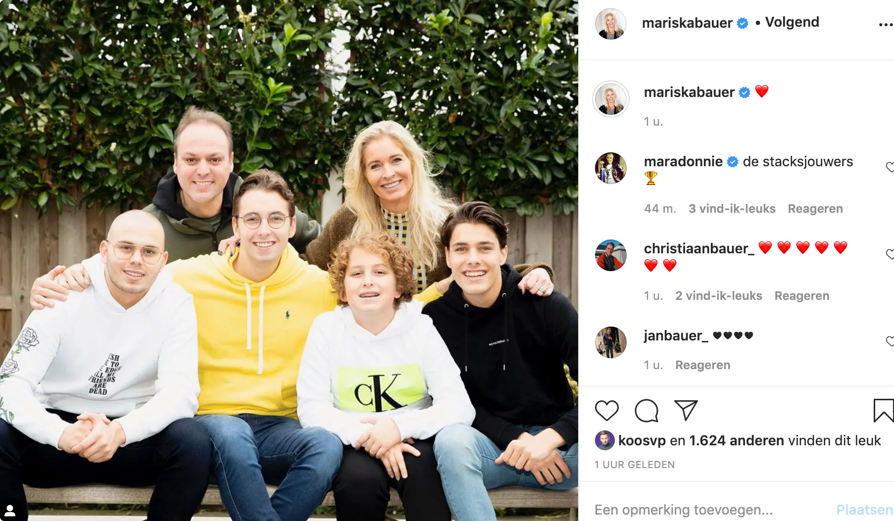 Op Instagram post ze deze prachtige familiefoto en die maakt veel indruk bij haar volgers. De echtgenote van Frans wordt overladen met hartjes en ook haar zoons reageren op de foto van hun moeder. "Wat een trots he? Om van te genieten", "Doe je goed al die mooie mannen om je heen!!!", "Wat een prachtige gezinsfoto" en "Rijkdom", wordt er verder zoal gereageerd door haar fans.