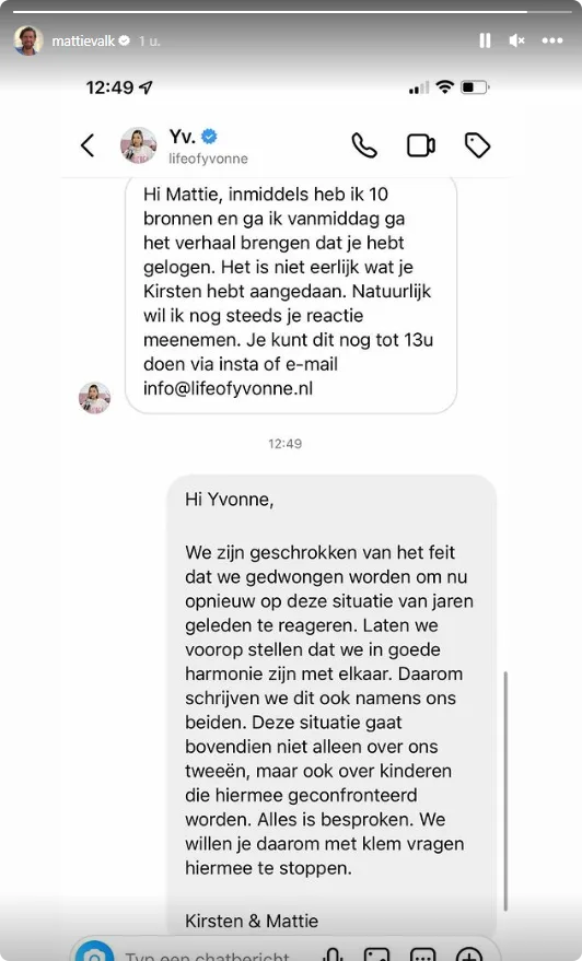 Mattie Valk en zijn ex-vriendin Kirsten Willemstein hebben Yvonne Coldeweijer gevraagd te stoppen met haar voorgenomen berichtgeving over hun verleden. Op Instagram deelt Valk dinsdagmiddag zijn verzoek aan de juicevlogger.