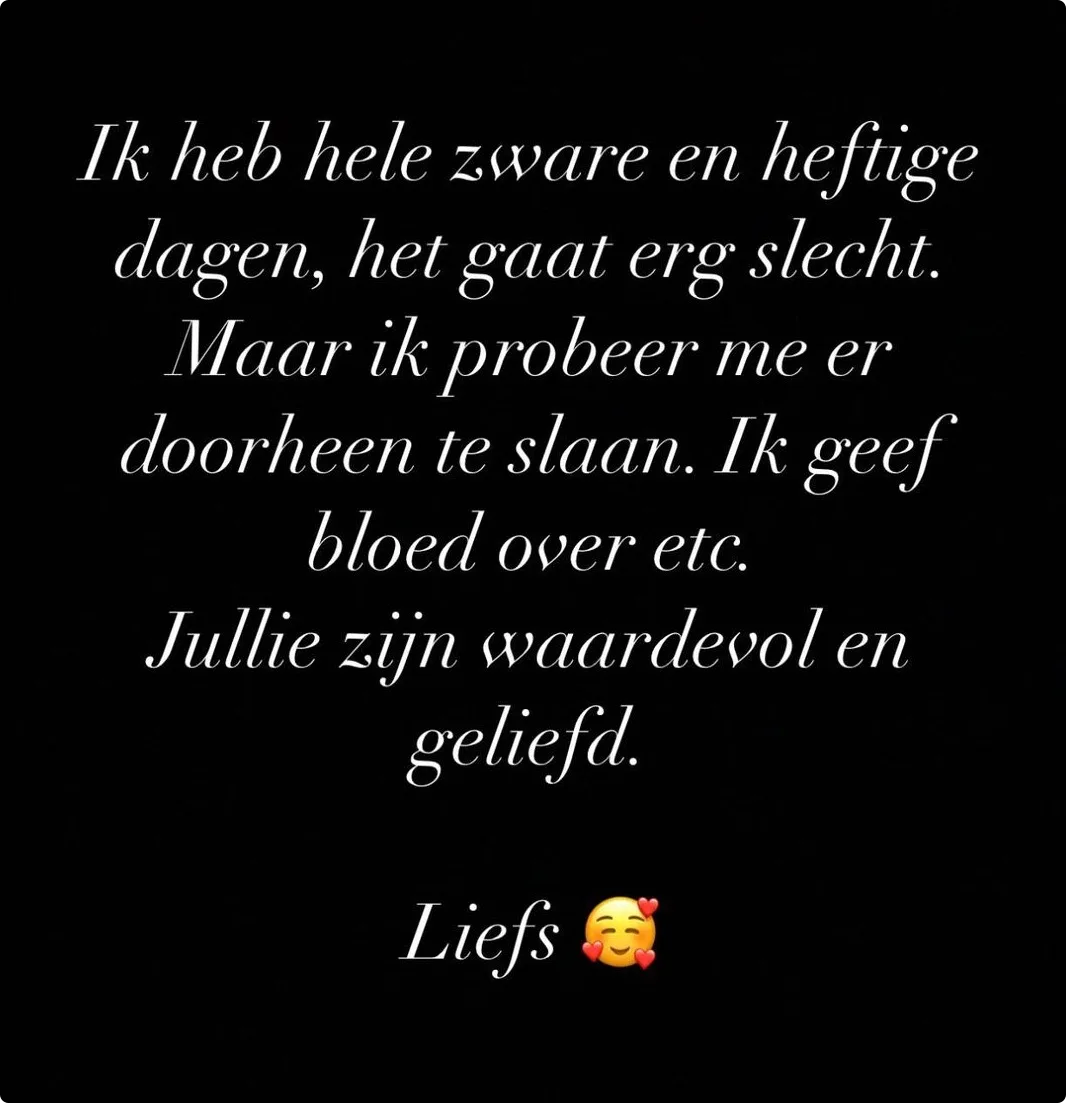 In haar Instagram Stories zegt ze: "Ik heb hele zware en heftige dagen, het gaat erg slecht. Maar ik probeer me er doorheen te slaan. Ik geef bloed over etc. Jullie zijn waardevol en geliefd. Liefs."