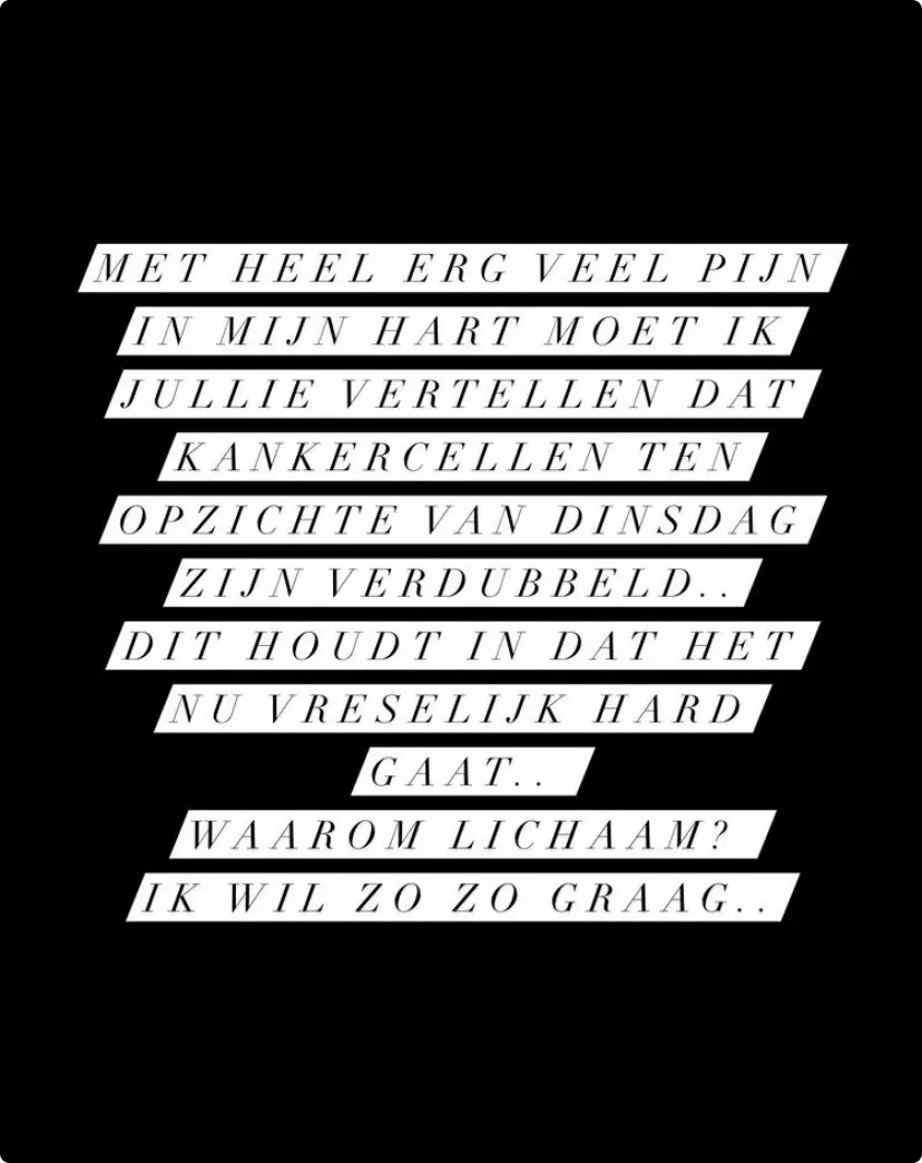 "Met heel erg veel pijn in mijn hart moet ik jullie vertellen dat kankercellen ten opzichte van dinsdag zijn verdubbeld", schreef Melissa in haar Stories. "Dit houdt in dat het nu vreselijk hard gaat, Waarom lichaam? Ik wil zo zo graag."