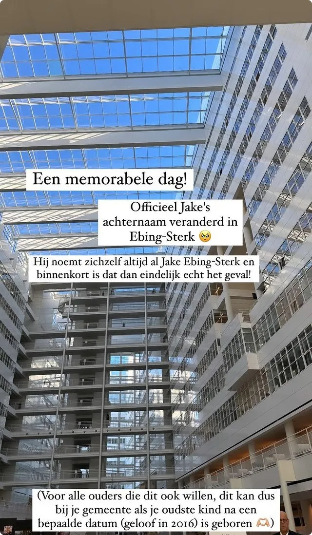 In een bericht op Instagram Stories laat de presentatrice weten dat haar zoon nu Jake Ebing-Sterk heet. "Een memorabele dag", schrijft ze bij een foto. "Hij noemt zichzelf altijd al Jake Ebing-Sterk en binnenkort is dat dan eindelijk echt het geval", aldus de presentatrice.